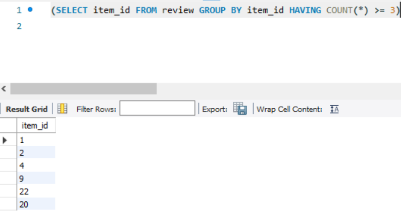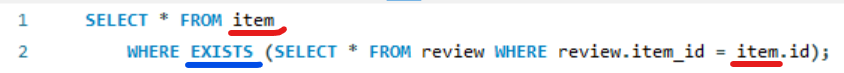 2. 그 row의 id(item.id) 값과 같은 값을 item_id(review.item_Id) 칼럼에 가진 review 테이블의 row가 있는지 조회한다.
