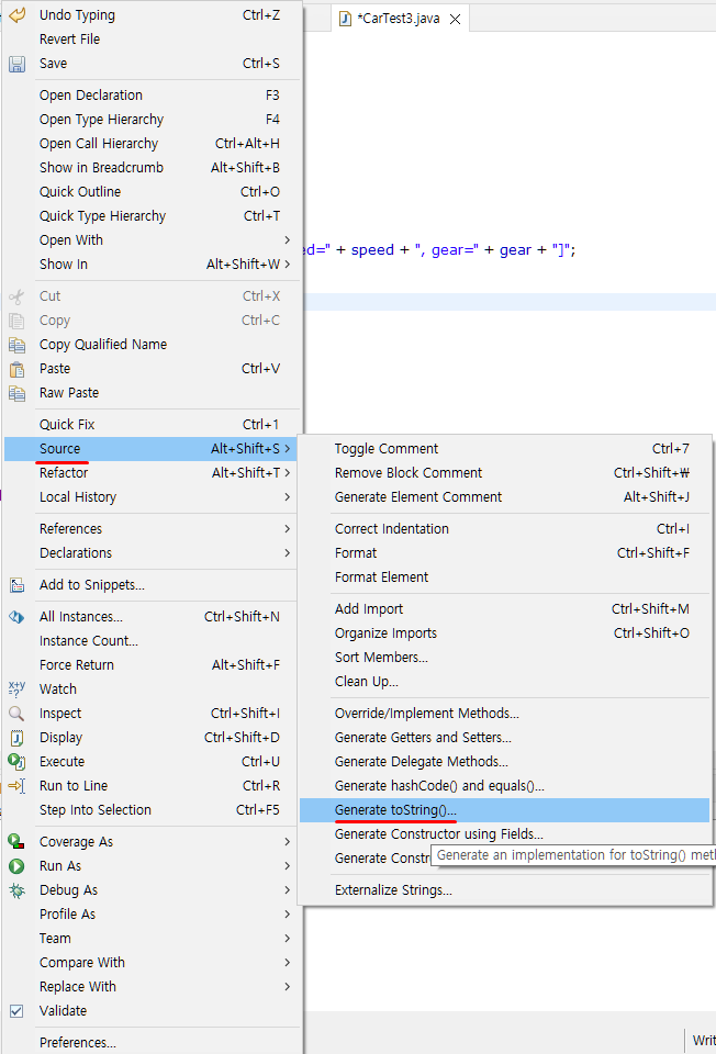 오른쪽 마우스를 눌러 source -> Generate toString()을 선택해준다.