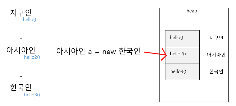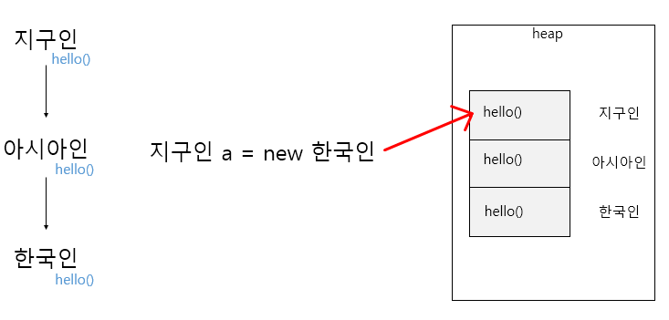 지구인, 아시아인, 한국인 모두 hello()라는 똑같은 메소드를 가지고 있다.