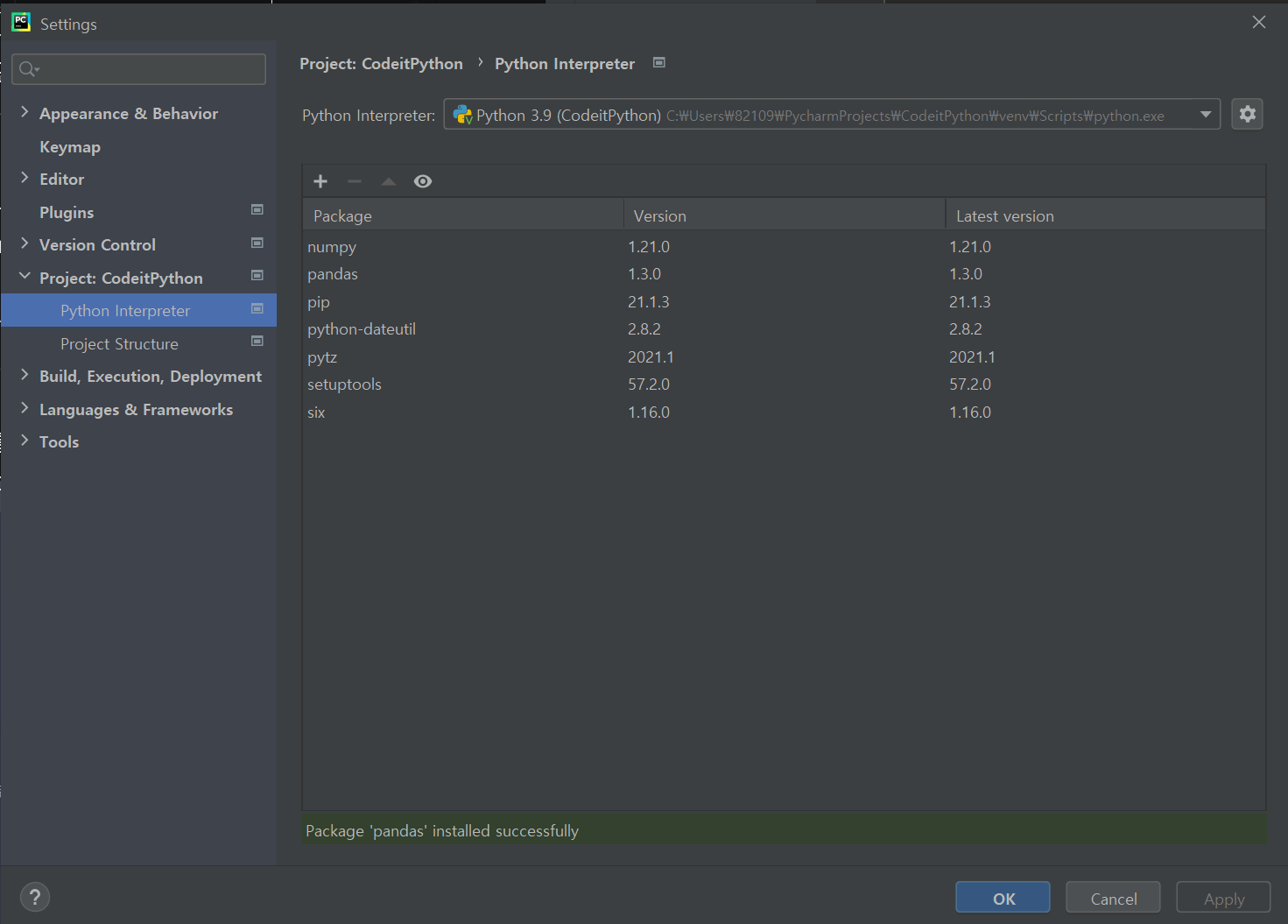 창을 닫고 나가보면 다음과 같이 pandas를 포함한 여러 패키지들이 추가되었다. pandas패키지를 설치하면 pandas 패키지가 필요로 하는 다른 패키지들도 자동으로 설치해준다.