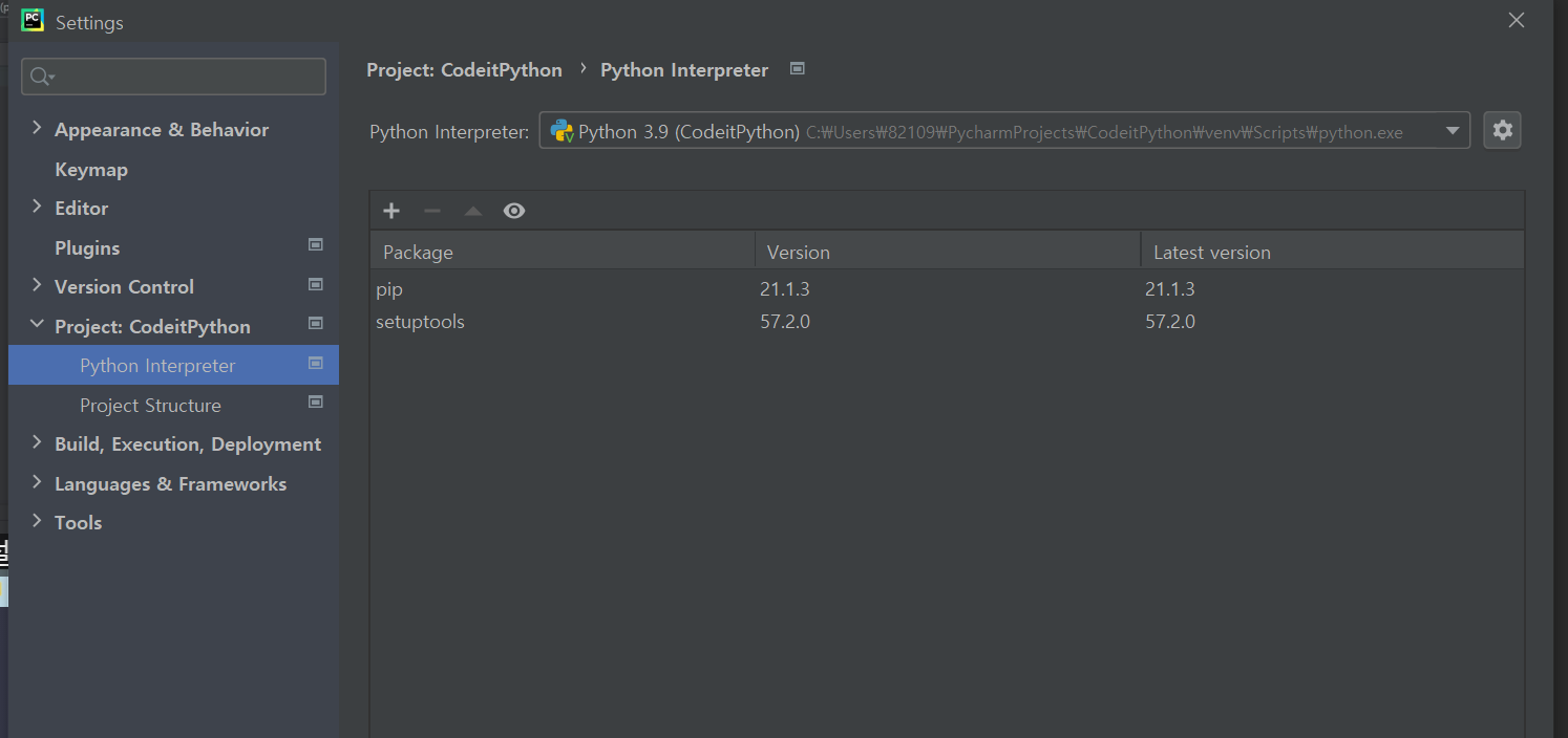 좌측 탭을 보면 Project가 있다 뒤에는 프로젝트 이름이고 이걸 클릭해서 Python interpreter에 들어가면 다음과 같은 화면이 등장한다. 여기에 새로운 패키지를 추가하려면 플러스 버튼을 눌러주면 된다.(패키지를 삭제하려면 옆에 있는 마이너스 버튼을 눌러주면 된다.)