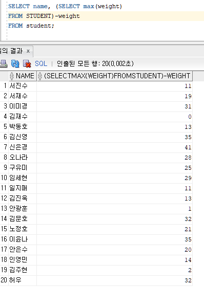 STUDENT 테이블에서 83 - weight를 한 값들이 나온다.
