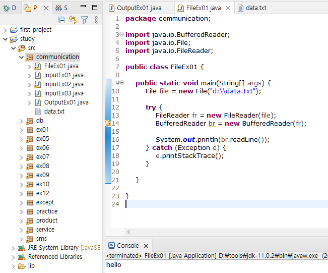 코드를 실행해보면 파일에 적힌 hello를 콘솔창으로 불러올수 있습니다.