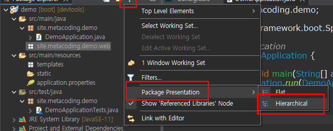 패키지를 보기 쉽게 Hierarchical을 선택해줍니다.