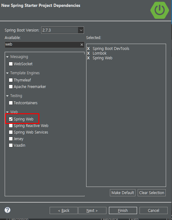 검색창에 web을 검색해서 Spring web을 체크해줍니다.