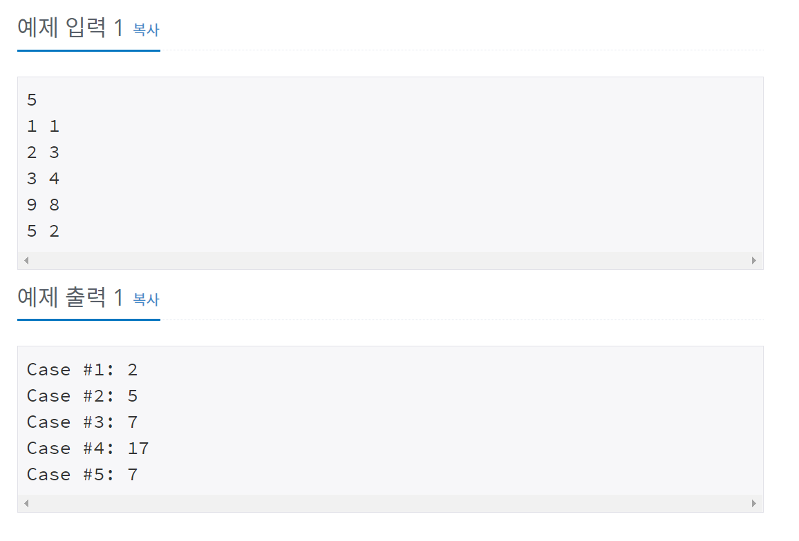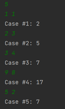 각 테스트 케이스마다 "Case #x: "를 출력한 다음, A+B를 출력한다. 테스트 케이스 번호는 1부터 시작한다.