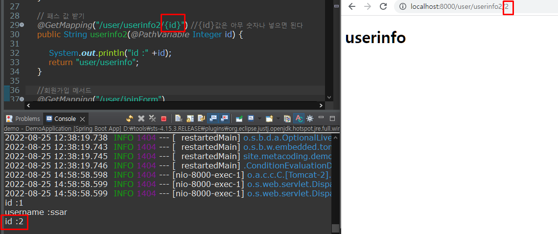 메서드의 파라미터 값으로 id=1 & username=ssar로 선언해주었다.