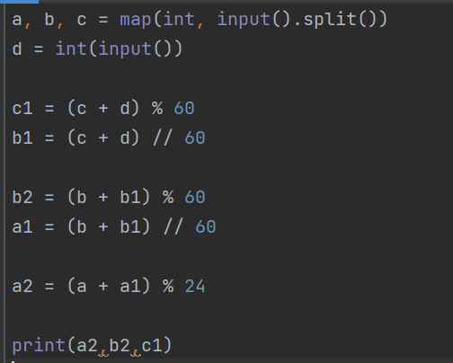 첫째 줄에는 현재 시각이 나온다. 현재 시각은 시 A (0 ≤ A ≤ 23), 분 B (0 ≤ B ≤ 59)와 초 C (0 ≤ C ≤ 59)가 정수로 빈칸을 사이에 두고 순서대로 주어진다. 두 번째 줄에는 요리하는 데 필요한 시간 D (0 ≤ D ≤ 500,000)가 초 단위로 주어진다.