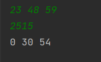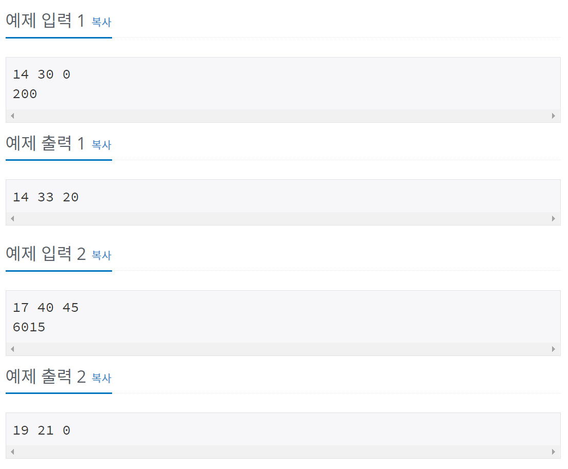 첫째 줄에 종료되는 시각의 시, 분, 초을 공백을 사이에 두고 출력한다. (단, 시는 0부터 23까지의 정수이며, 분, 초는 0부터 59까지의 정수이다. 디지털 시계는 23시 59분 59초에서 1초가 지나면 0시 0분 0초가 된다.)