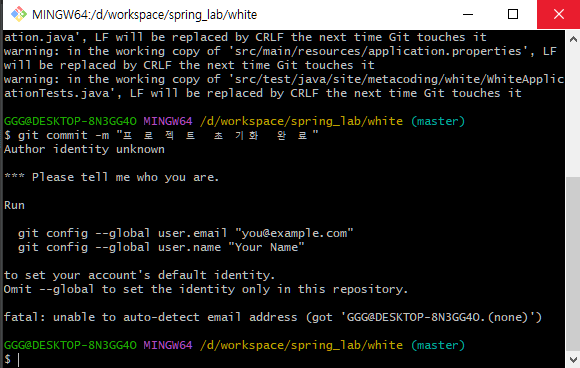 나의 git email이랑 git name을 작성하라고 오류가 발생한다.