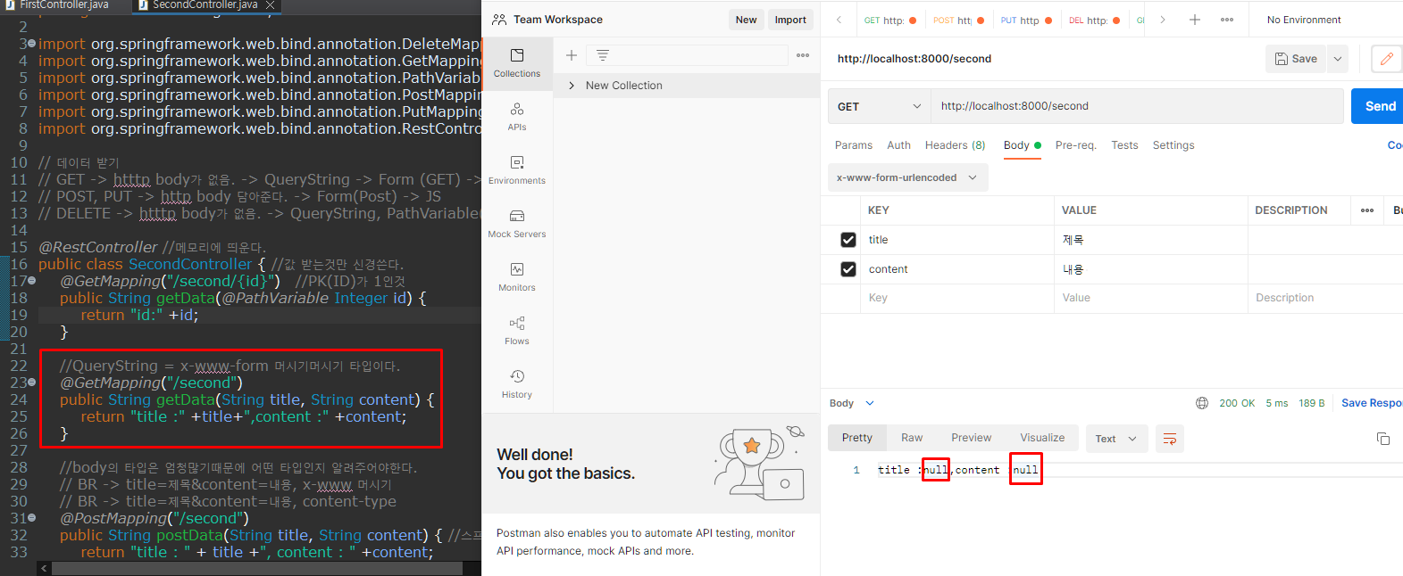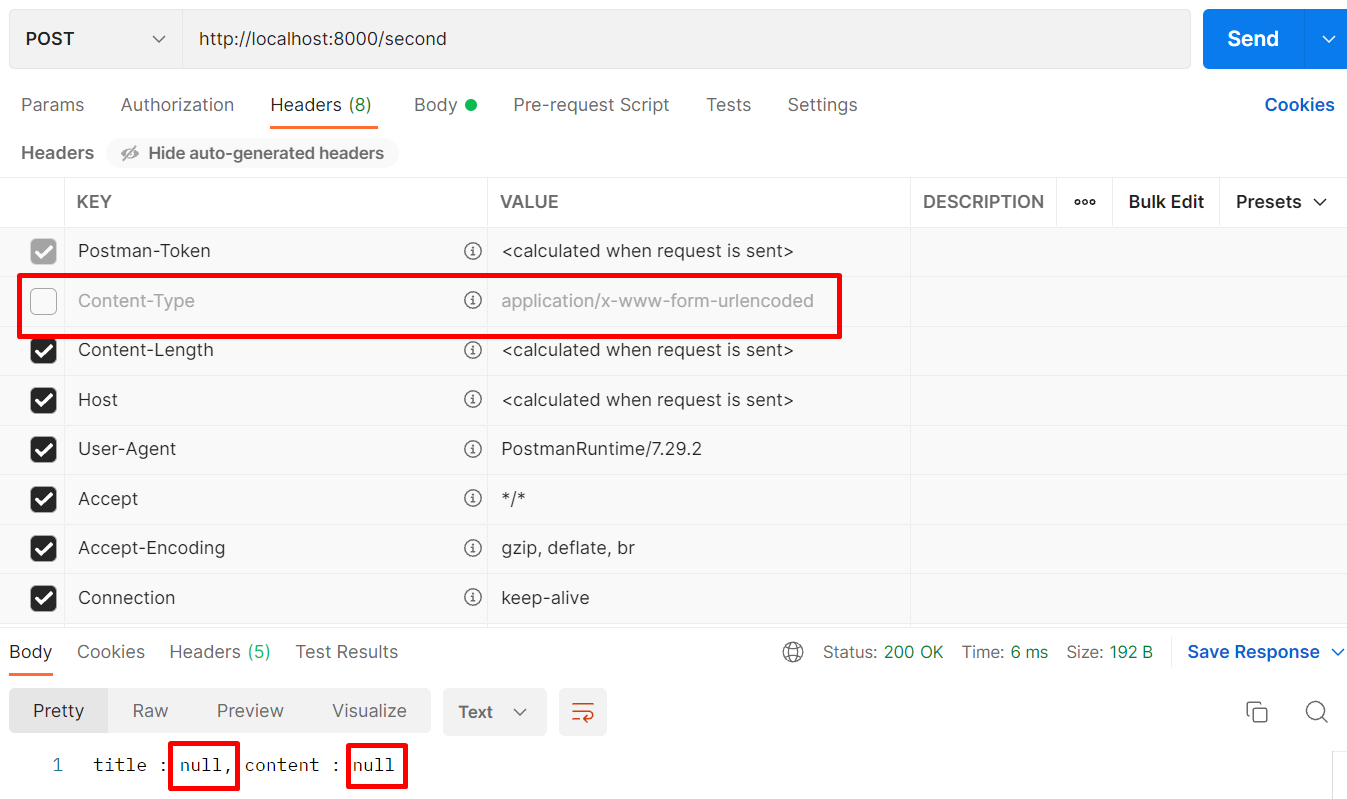 body에다가 key,value값을 넣어주었지만 출력값에 null이 나온다.