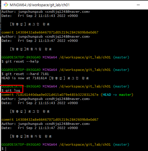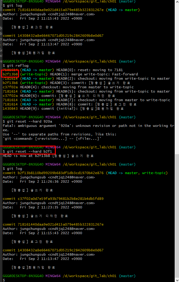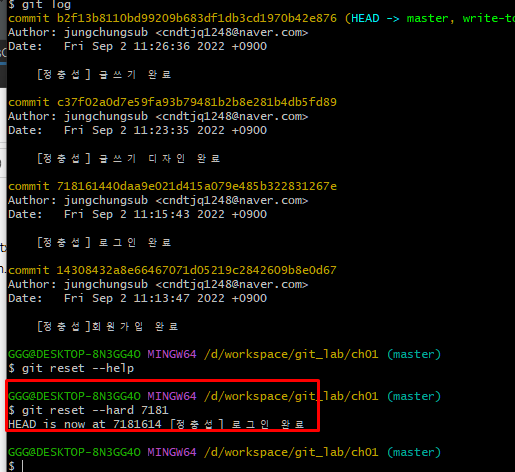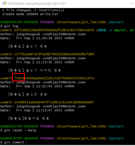 만약 merge를 했지만 이전으로 돌아가야 할 경우 실습(write를 삭제 해야 할 경우) - git reset --hard 해시코드