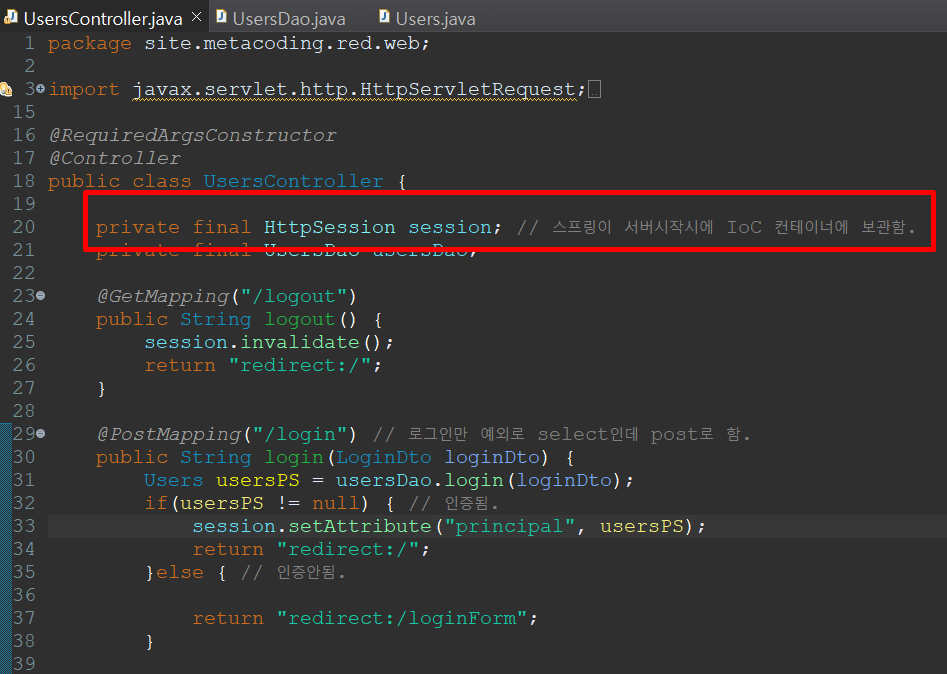 세션은 Dispatcher Servlet이 있으면 Ioc컨테이너에 넣어놓는다.