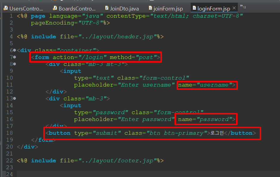 전송해야 할 위치는 컨트롤러의 위치인 action = "/login"으로 정한다.