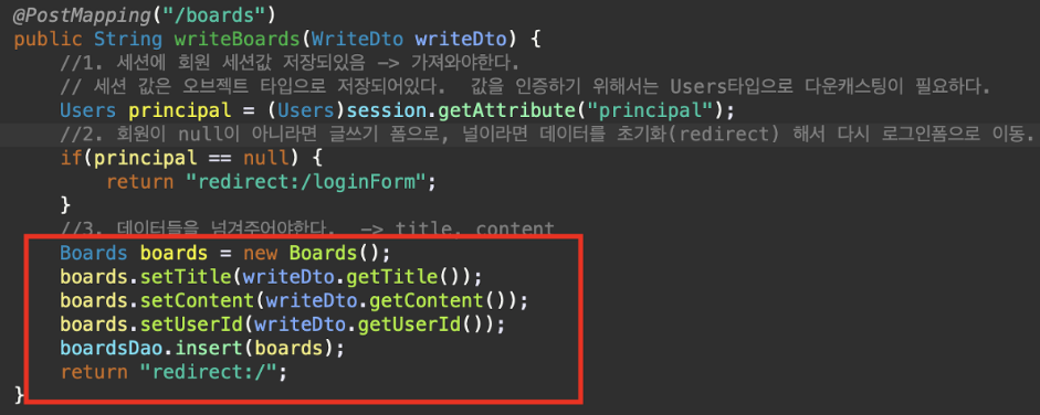 (Boards를 전달하기 때문에 BoardDao의 Insert메서드는 Boards를 받아야한다.)