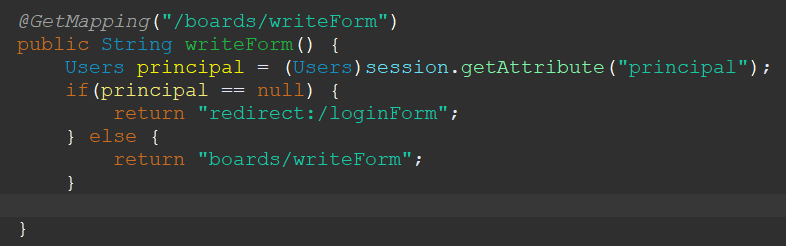 세션에서 인증이 된 사용자라면 글쓰기 writeForm으로 이동, 아니라면 다시 로그인 폼으로 이동한다.