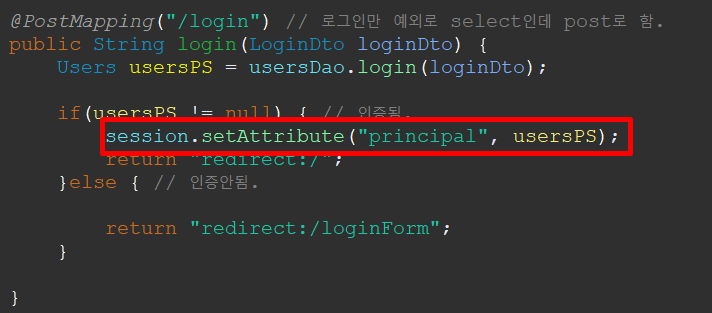 users로그인 할때 session의 키값 이름으로 principal로 했다.