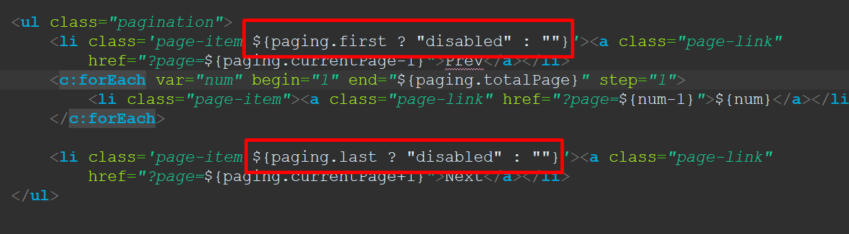 삼항연산자를 사용하여 first,last가 true이면 disabled이 실행되고 false이면 "" 이 실행한다.