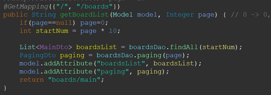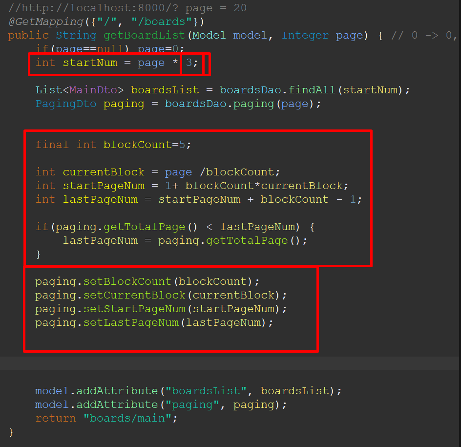 boardsDao.paging에서 page를 넘겨서 PagingDto를 받았다.