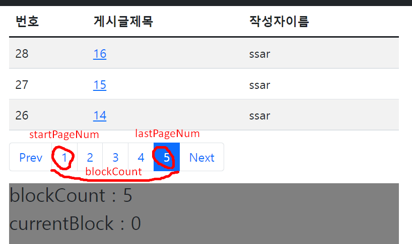 blockCount 고정된 값. 한페이지에 페이지 넘버 개수 5