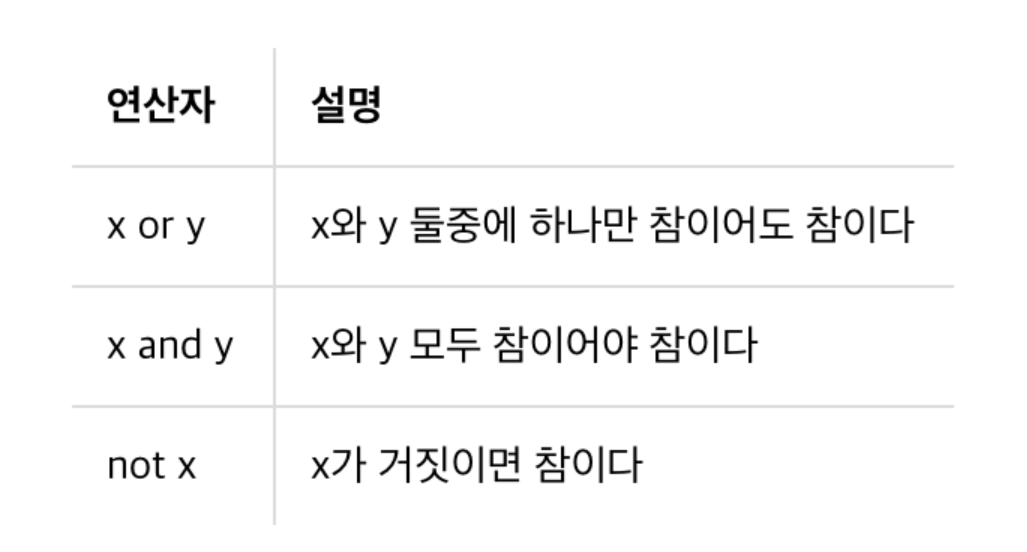 조건을 판단하기 위해 사용하는 다른 연사자로는 and, or, not이 있다. 각각의 연산자는 다음처럼 동작한다