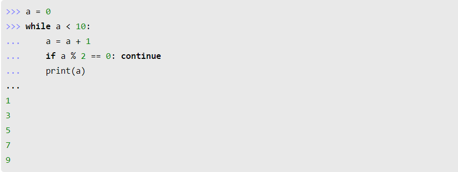 위 예는 1부터 10까지의 숫자 중 홀수만 출력하는 예이다. a가 10보다 작은 동안 a는 1 만큼씩 계속 증가한다. if a % 2 == 0(a를 2로 나누었을 때 나머지가 0인 경우)이 참이 되는 경우는 a가 짝수일 때이다. 즉 a가 짝수이면 continue 문장을 수행한다. 이 continue문은 while문의 맨 처음(조건문: a<10)으로 돌아가게 하는 명령어이다. 따라서 위 예에서 a가 짝수이면 print(a)는 수행되지 않을 것이다.