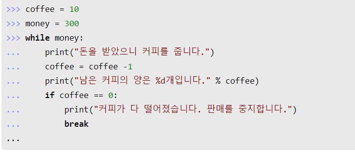 위 코드처럼 money가 300으로 고정되어 있으므로 while money:에서 조건문인 money는 0이 아니기 때문에 항상 참이다. 따라서 무한히 반복되는 무한 루프를 돌게 된다. 그리고 while문의 내용을 한 번 수행할 때마다 coffee = coffee - 1에 의해서 coffee의 개수가 1개씩 줄어든다. 만약 coffee가 0이 되면 if coffee == 0: 문장에서 coffee == 0:이 참이 되므로 if문 다음 문장 "커피가 다 떨어졌습니다. 판매를 중지합니다."가 수행되고 break문이 호출되어 while문을 빠져나가게 된다.