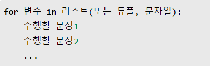 리스트나 튜플, 문자열의 첫 번째 요소부터 마지막 요소까지 차례로 변수에 대입되어 '수행할 문장1', '수행할 문장2'등이 수행된다.