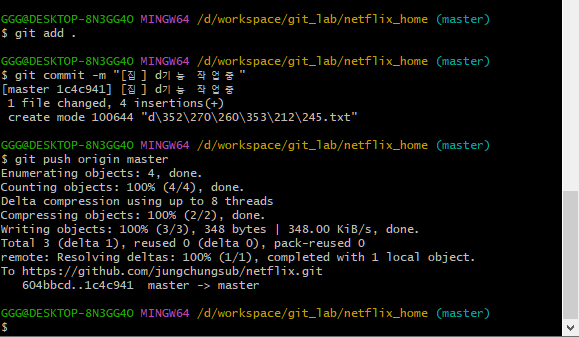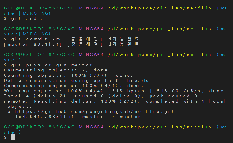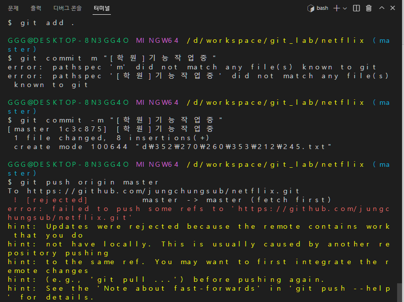 - netflix와 netflix_home에서 push한 형상이 달라서 거부당합 (현재 git에 d기능이 있기 때문)