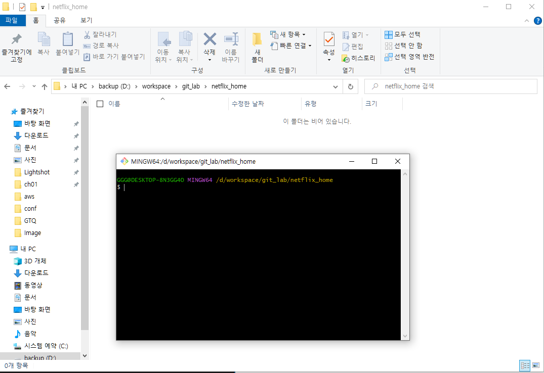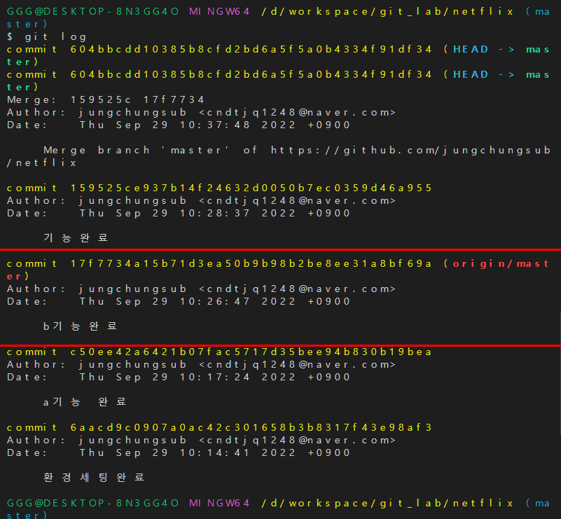 -> 현재 형상이 같은 상태에서 d를 추가한것이니까 netflix_home과 git의 netflix로그가 같아짐