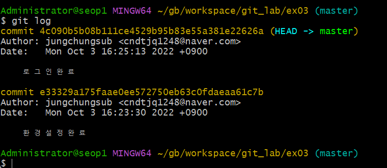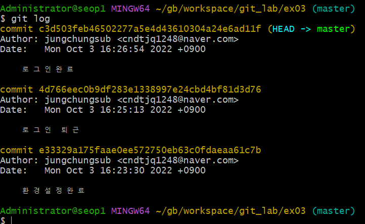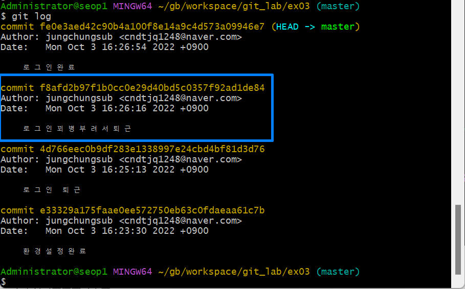 git log로 확인을 해보면 로그인 아파서 퇴근이 없어진것을 확인할수있다.