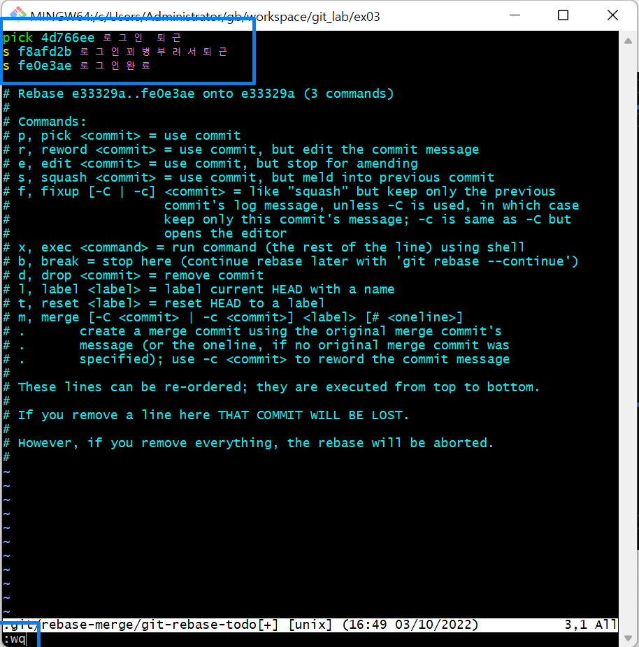 파란박스의 3개의 커밋로그를 찌그려뜨려야 한다면