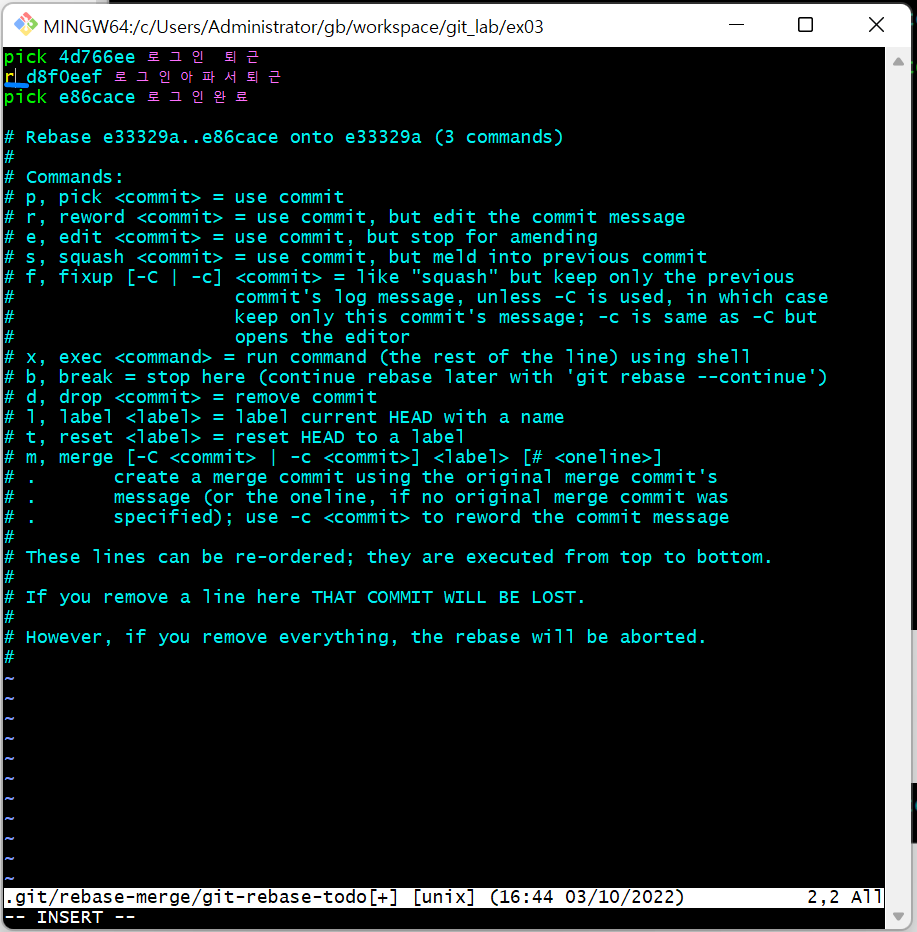 '로그인꾀병부려서퇴근'으로 commit이름이 바뀐것을 확인 할 수 있다.