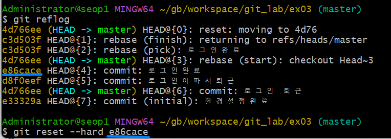 git log에는 삭제된 로그값이 없기때문에 git reflog를 통해서 확인한다.