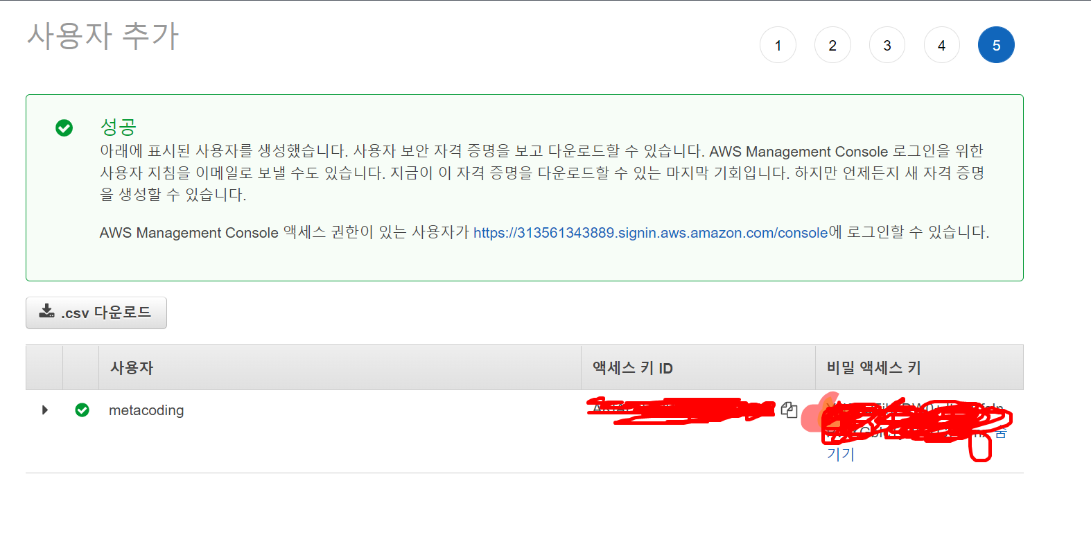 : 비밀 액세스 키는 추후 확인이 되지 않으니 다운 받아 저장해둔다.
