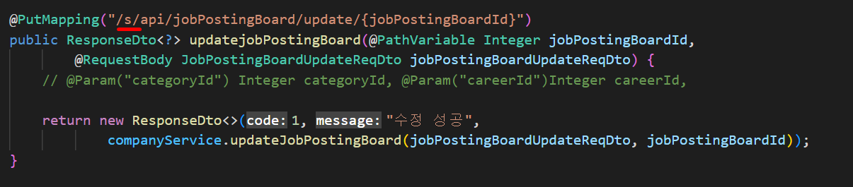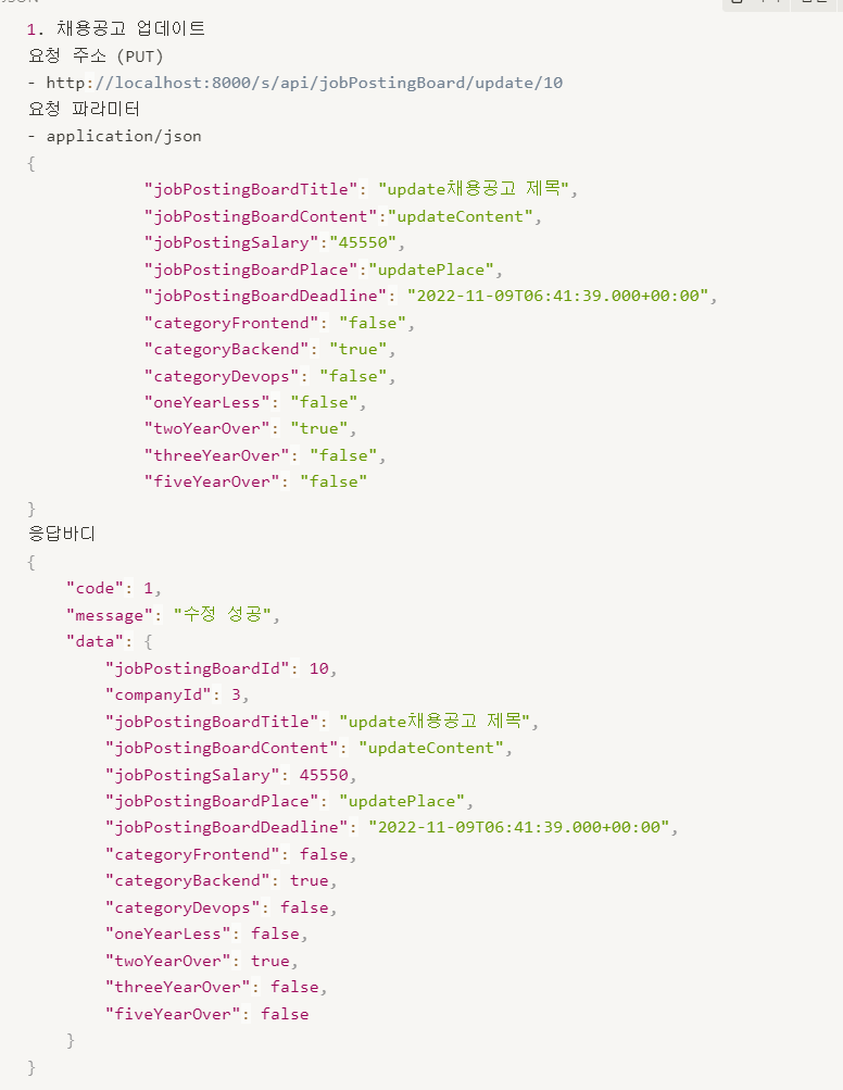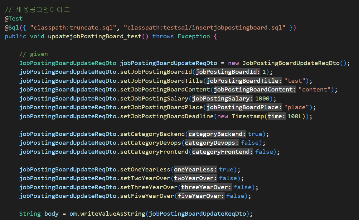 채용공고수정은 3개의 테이블을 수정해야하므로 각테이블의 값들을 모두 builder를 사용하여 메서드화시켜준다.
