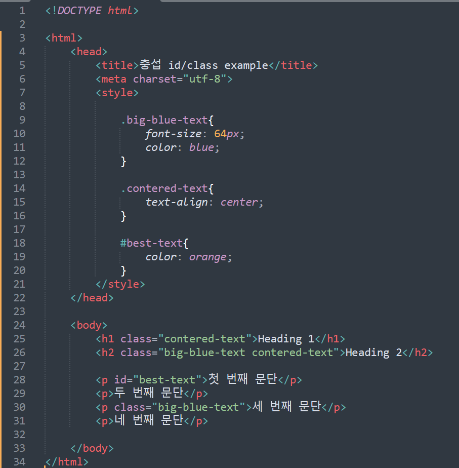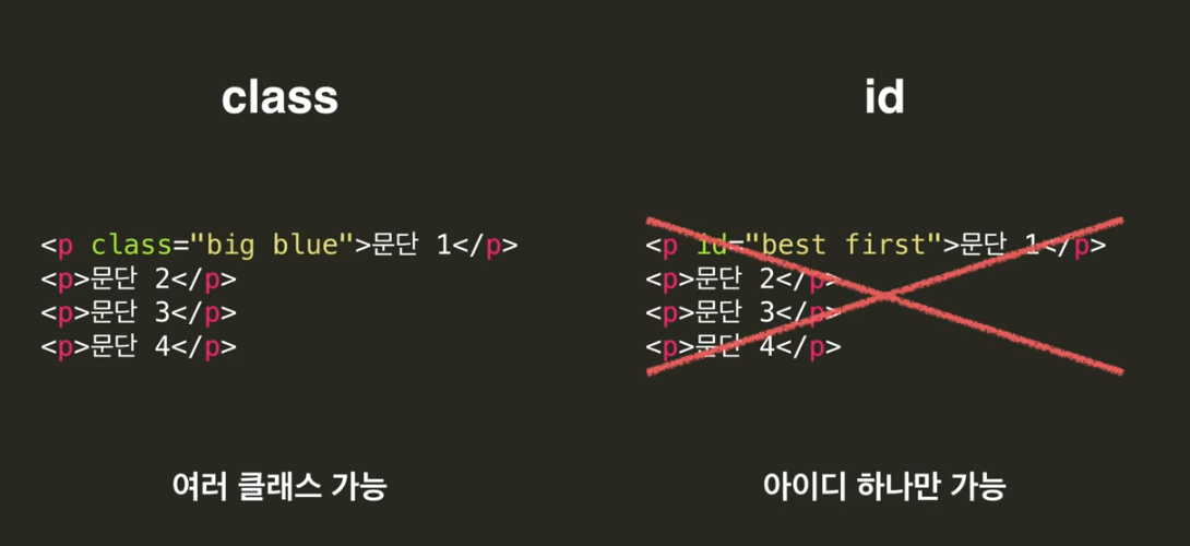 2. 한 요소가 여러 클래스를 가질 수 있지만, 한 요소는 하나의 아이디만 가질 수 있습니다. (단, 한 요소가 클래스도 여러 개 갖고 아이디도 하나 가질 수 있습니다!)