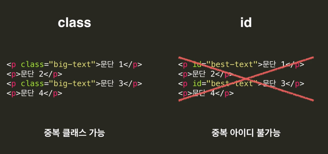 1. 같은 클래스 이름을 여러 요소가 가질 수 있지만, 같은 아이디를 여러 요소가 공유할 수는 없습니다.
