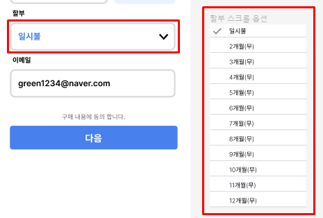카드 결제페이지에서 할부여부 버튼을 누르면 아래와 같이 나오게 할것이다.