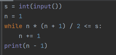 1부터 순서대로 더해서 s보다 커지게 되면 n에서 1을 뺀다.