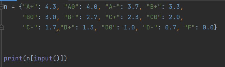 n = {"A+": 4.3, "A0": 4.0, "A-": 3.7, "B+": 3.3,