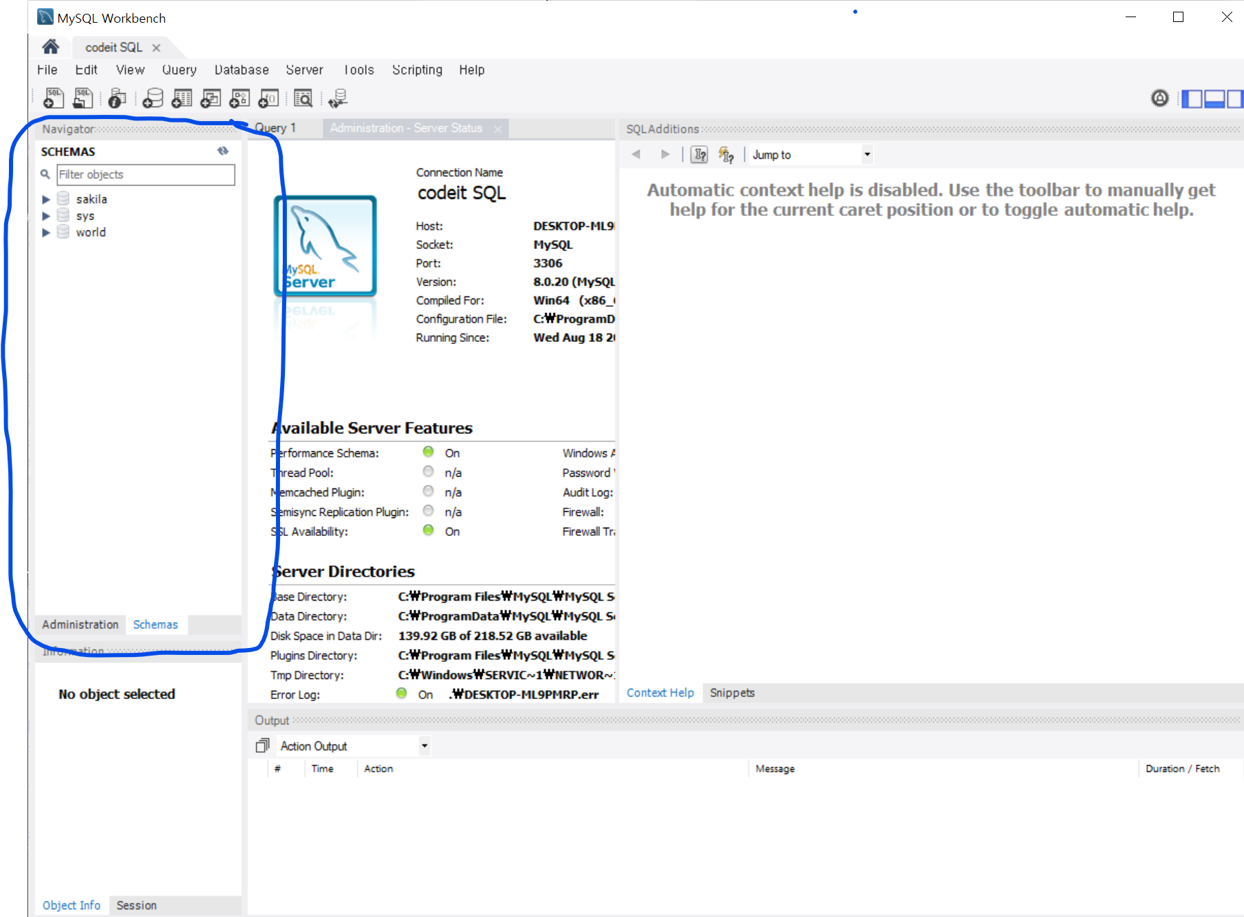 앞으로 내가 접속한 MySQL 서버의 모든 데이터베이스는 파란색 부분 영역에 보이게 될 것이다.