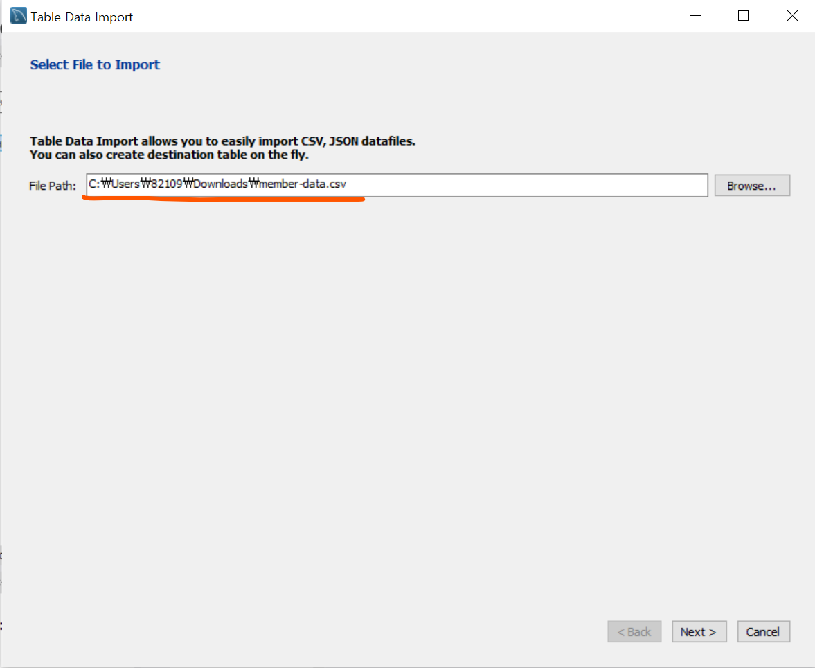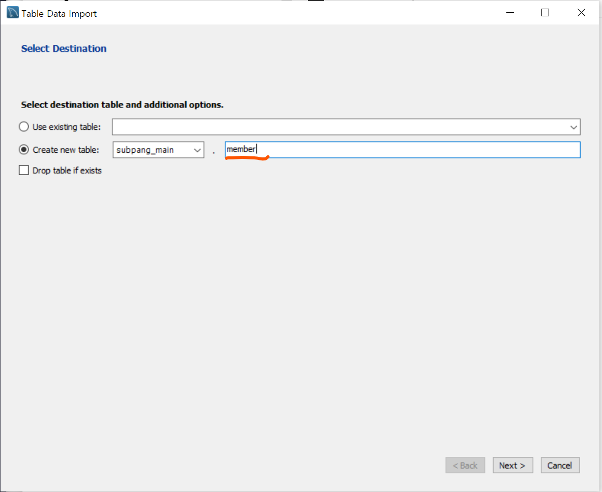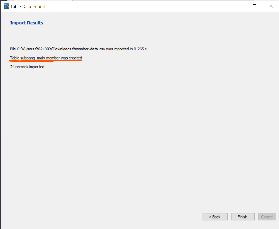 그럼 CSV파일로 생성할 테이블의 이름을 설정하는 창이 뜬다. 테이블을 이름을 member라고 작성해주면 된다.