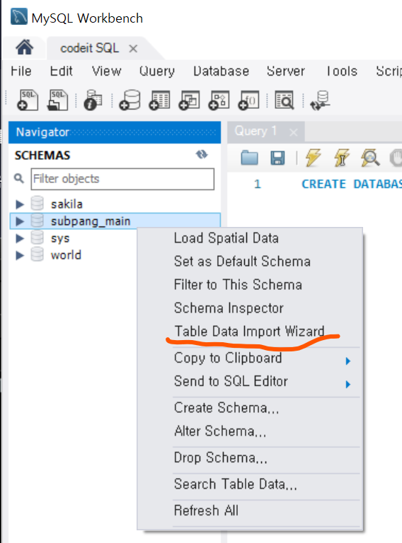 1. subpang_main 데이터베이스 커서 위에 오른쪽 마우스 버튼을 누른 다음 Table Data Import Wizard 를 클릭하세요