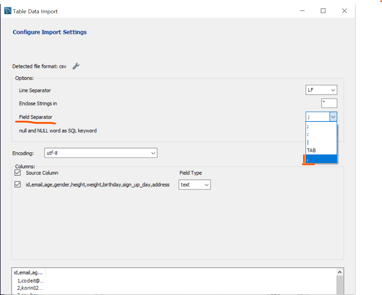 Field Separator(컬럼 구분자) 부분의 기호를,(콤마) 표시로 바꿔주고 Next 버튼을 눌러준다.