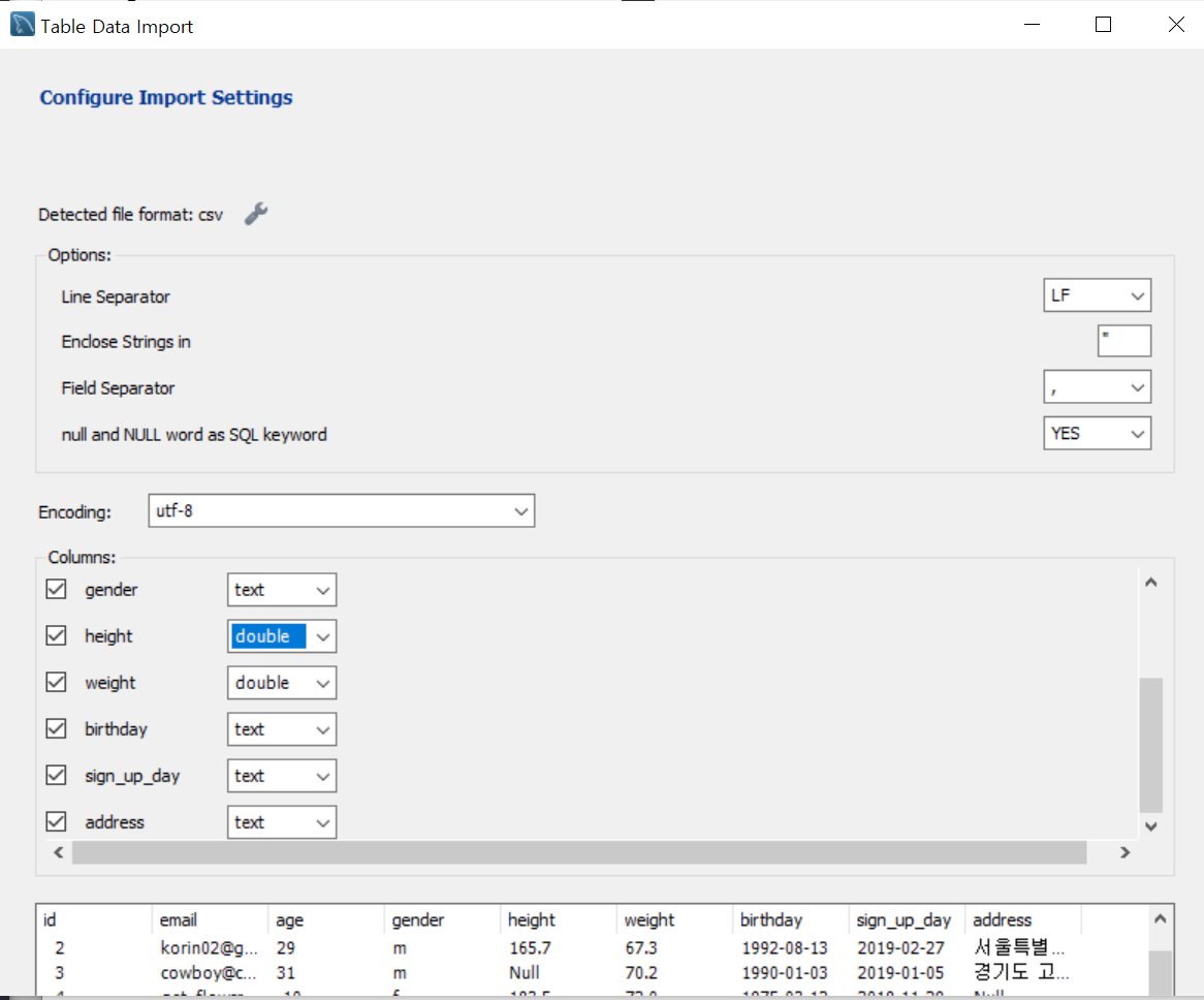 height 컬럼을 weight칼럼과 데이터 타입으로 double로 바꾸어준다.