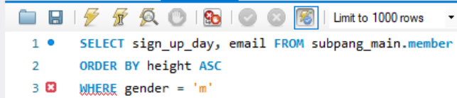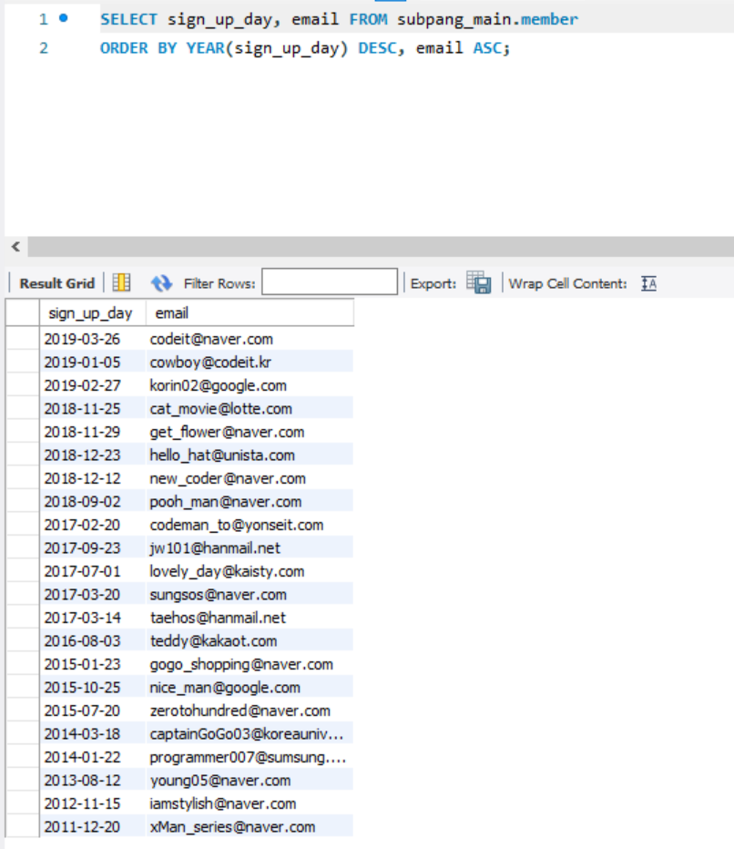 예시) 섭팡에 가입한 연도를 기준으로 가장 최근에 가입한 사람부터 내림차순으로 정렬하고, 같은 연도에 가입한 사람들은 다시 이메일 주소를 기준으로 오름차순으로 정렬(sign_up_day, email 만 나타나도록)