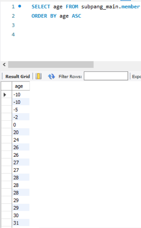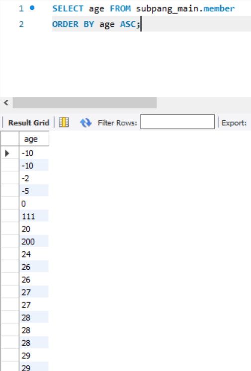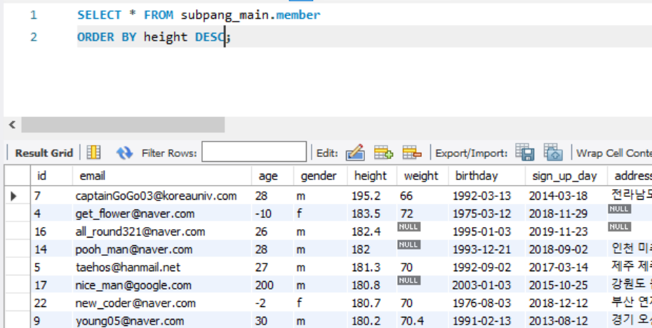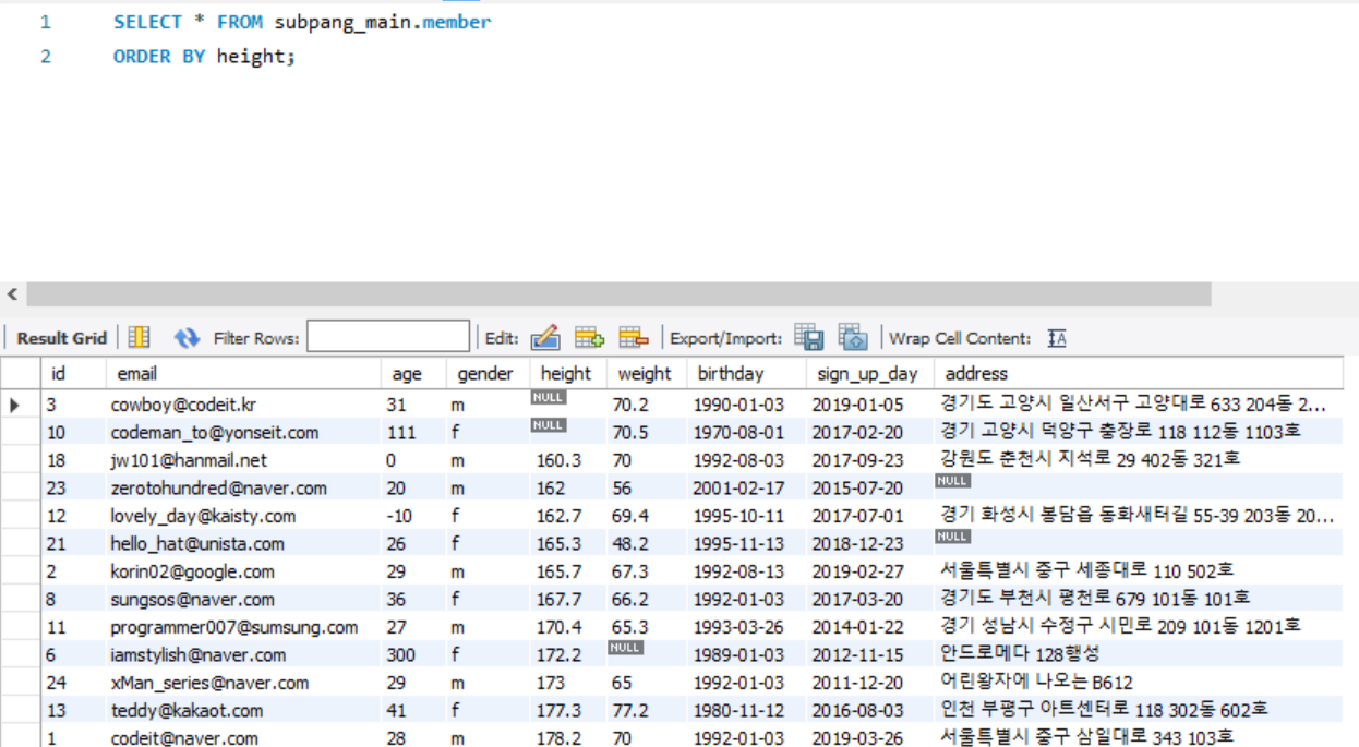 BY뒤에 정렬 기준을 적어 주면 된다. 위 구문은 height 칼럼이 정렬 기준이 되었다.