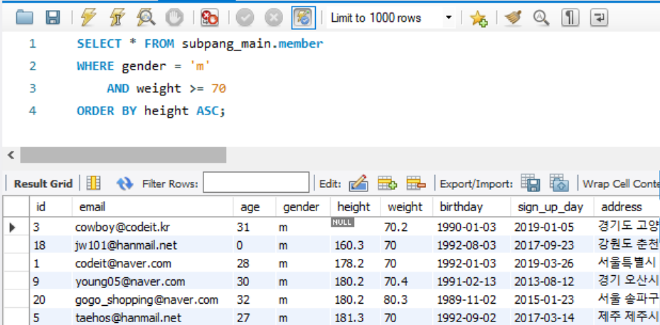 예시) 성별이 M이고 몸무게가 70 넘는 회원들을 height 기준으로 오름차순 정렬