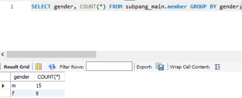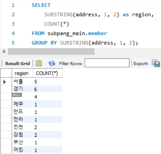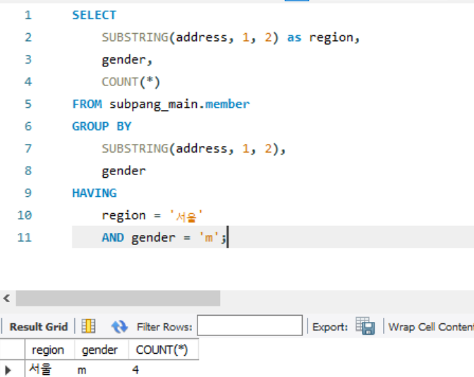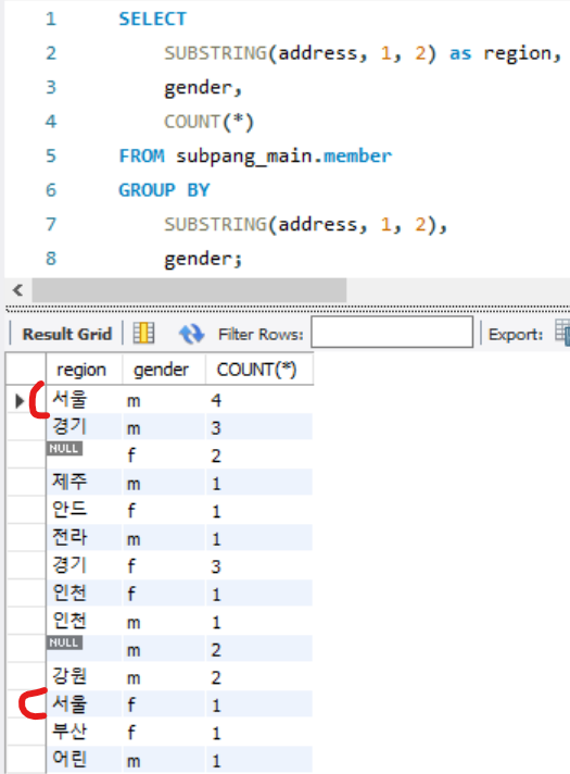 빨간 줄을 보면 같은 서울이라도 성별이 m인 회원은 4명, f인 회원은 1명이라는 것을 확인할 수 있다.